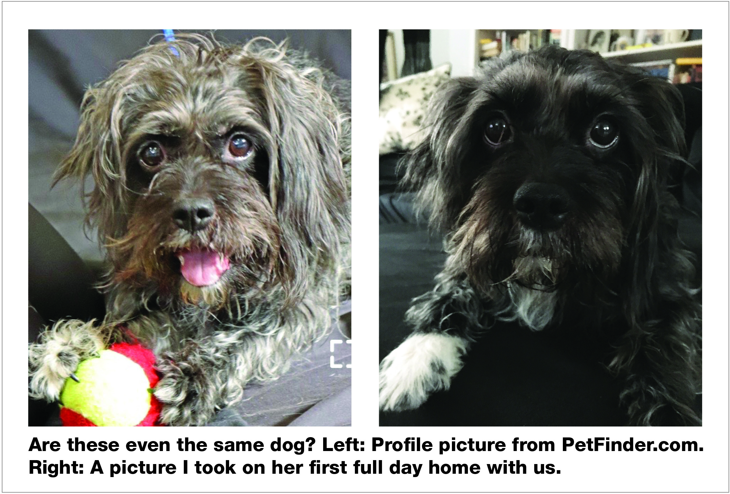 At first I was not picky: boy or girl, light or dark, five miles away or two hundred. I just wanted to fill the void. But Michael suggested holding out for just the right addition to the family. I entered many filters into PetFinder: female, small, housetrained, good with dogs, within fifty miles, terrier of some sort, black/gray.
